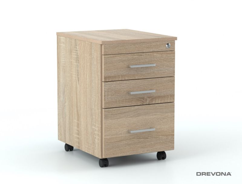 Uzamykateľný kontajner do kancelárie s tromi zásuvkami je vyrobený z kvalitnej laminovanej drevotrieskovej dosky.
