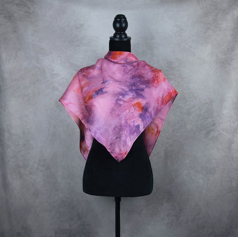 Materiál tejto hodvábnej šatky tvorí 100% prírodný hodváb typu crepe-satén, ktorý patrí medzi najkvalitnejšie hodváby na svete. Vyznačuje sa výnimočnou hebkosťou, jemným leskom a krásnou splývavosťou. Šatka je navyše farbená ručne špeciálnym pigmentom určeným priamo na hodváb, pričom dôraz sa kladie na dokonalé zafixovanie farby vo vláknach materiálu. Vďaka tomu vznikajú žiarivé farby a luxusné odtiene, ktoré dodávajú tejto hodvábnej šatke exkluzívny charakter.