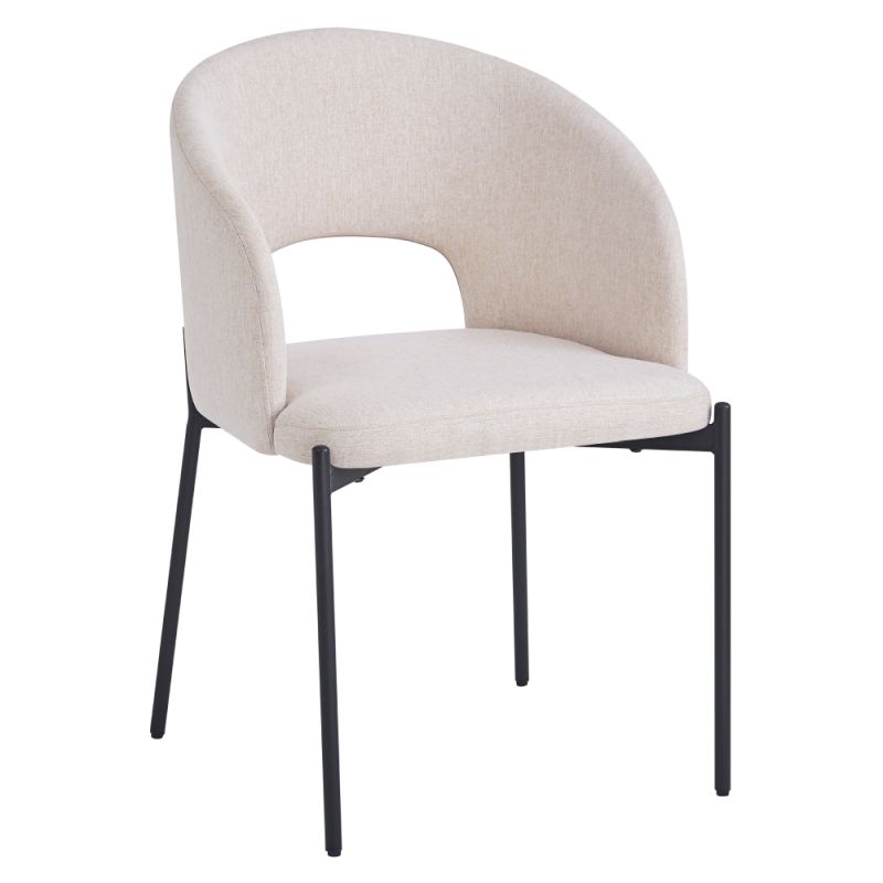 Stolička je čalúnená látkou v béžovom prevedení a doplnená o čierne kovové nožičky, ktoré jej dodávajú stabilitu