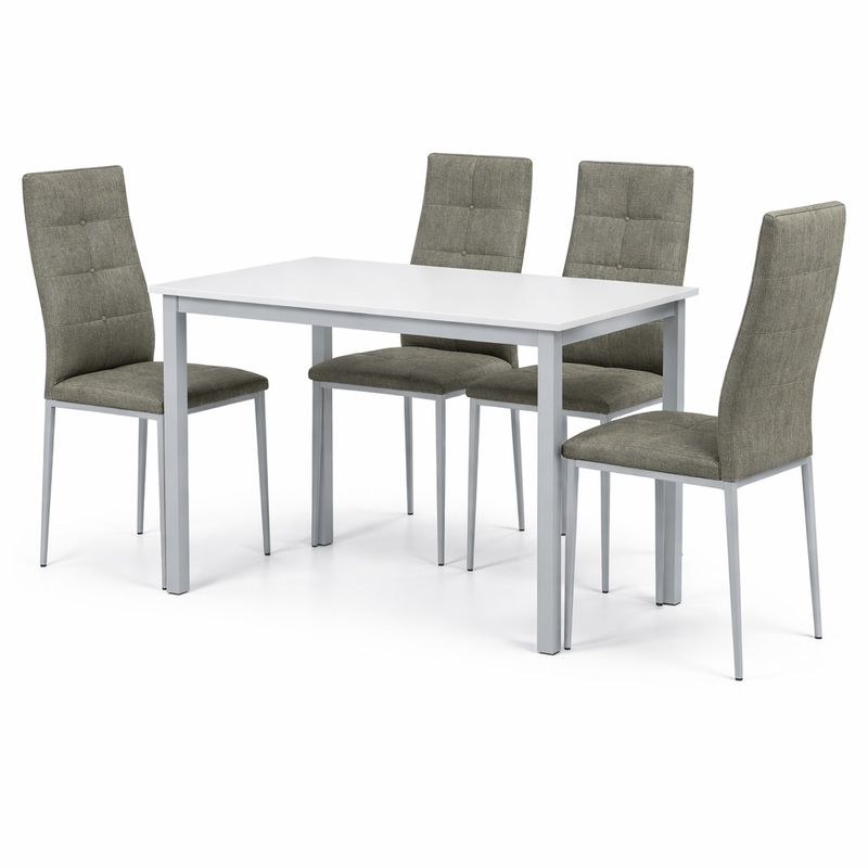 Jedálenský stôl s doskou z MDF v bielom dekore pôsobí prirodzene a nadčasovo. Matná povrchová úprava je odolná voči bežnému opotrebovaniu a jednoduchá na údržbu. Stabilná kovová podnož v sivom prevedení zabezpečuje pevnosť a moderný industriálny vzhľad. Vďaka kompaktným rozmerom je stôl ideálny aj do menších priestorov.