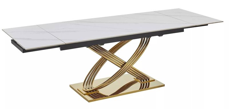 Rozkladací stôl Hermes II predstavuje luxusný dizajnový prvok do jedálne či obývačky, ktorý kombinuje moderný mramorový vzhľad s lesklou zlatou podnožou