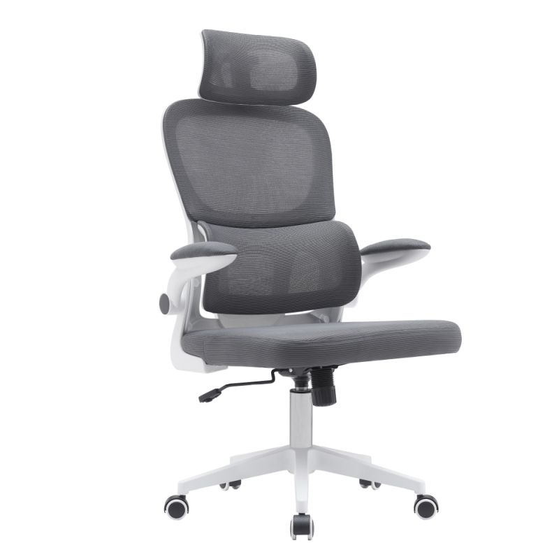 Kreslo je čalúnené tmavosivou sieťovinou v kombinácií s bielym plastom