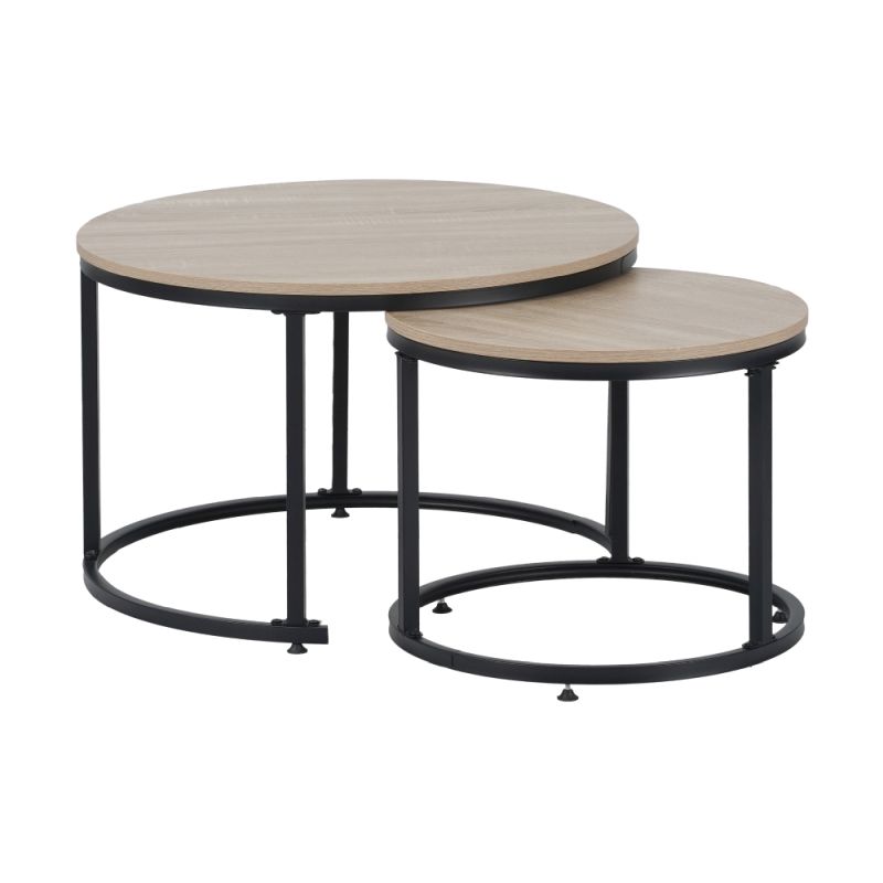 Pozostáva z dvoch okrúhlych stolíkov s čiernou kovovou konštrukciou a doskami z laminovanej DTD v obtieni dub sonoma