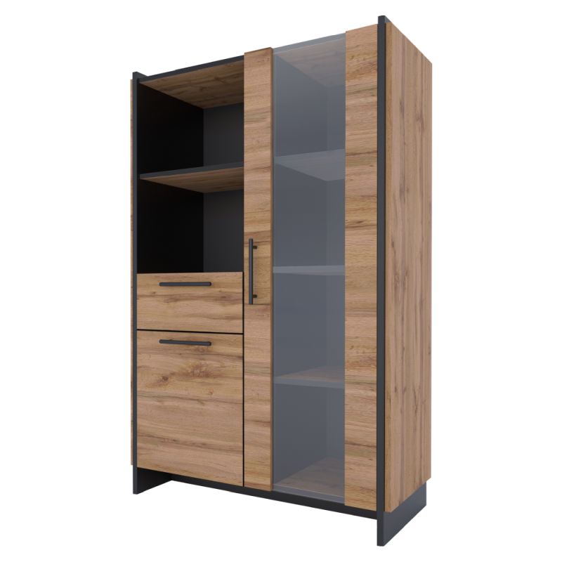 Nízka vitrína 1D1W AMONI ponúka úložný priestor v podobe políc, šuplíka, otvoreného úložného priestoru, jednodverovej skrinky a vitríny s dvierkami so sklenenou výplňou