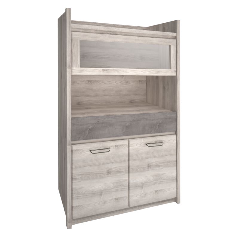 Má jednu otvorenú policu a vitrínovú časť s výklopnými dvierkami