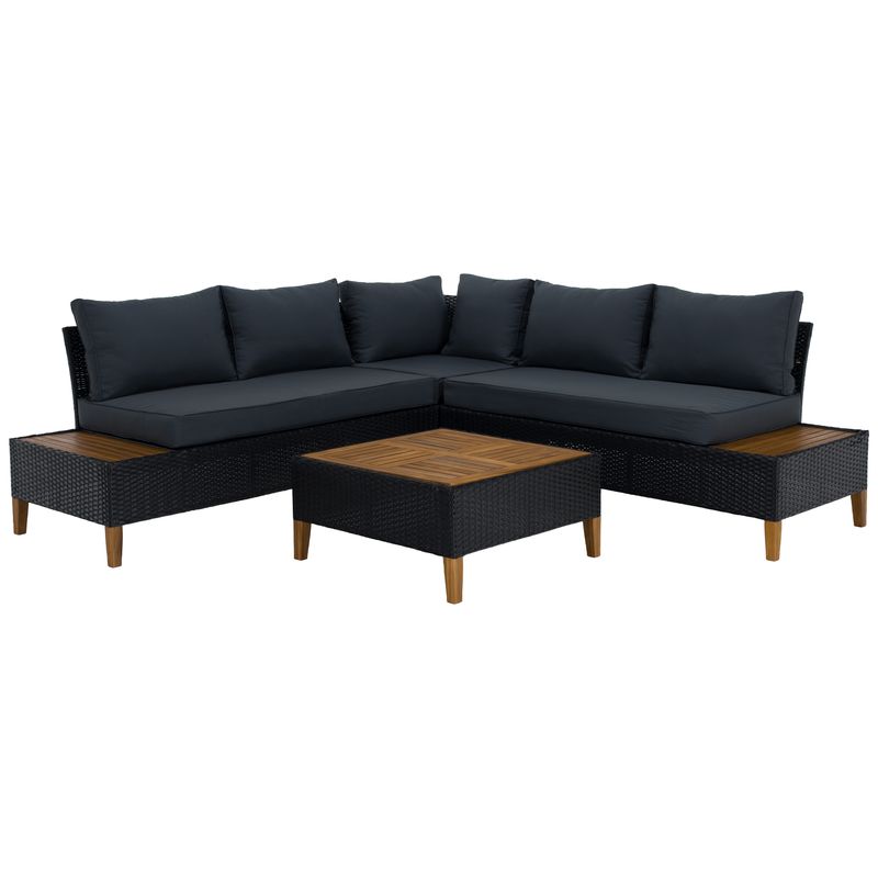 - Záhradný, ratanový set, akáciové drevo, čierny ratan, sivá látka, MALKOM