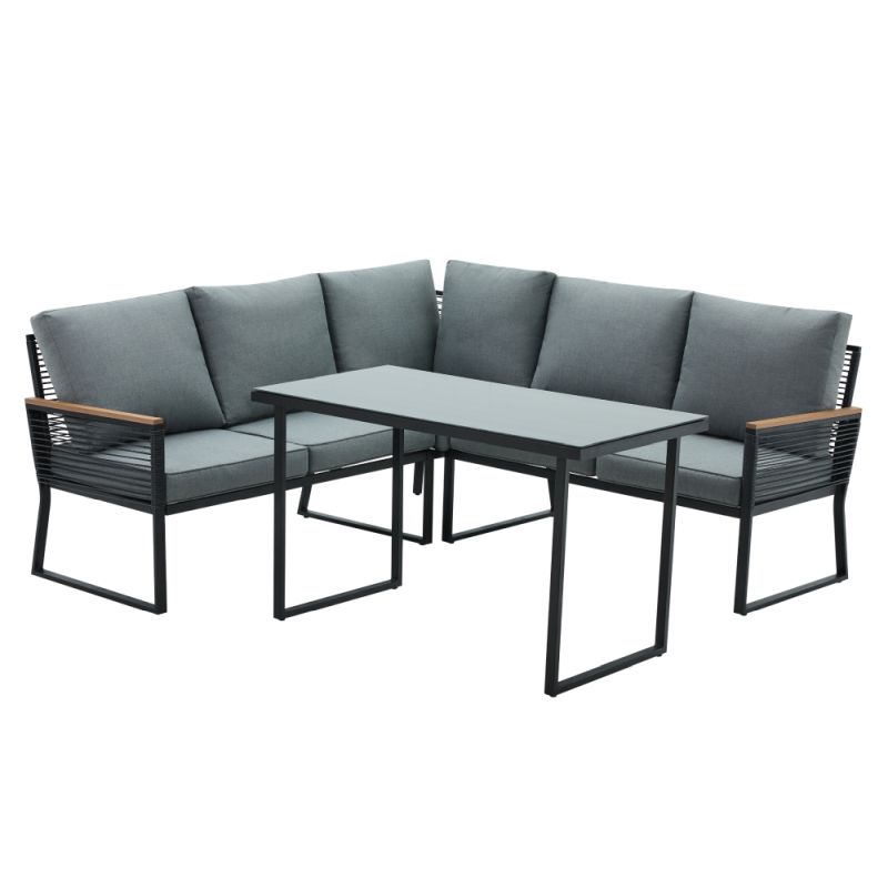 Elegantná kombinácia čiernej kovovej konštrukcie, sivého čalúnenia a prírodných drevených detailov z akáciového dreva vytvára nadčasový vzhľad, ktorý sa ľahko prispôsobí akémukoľvek exteriéru
